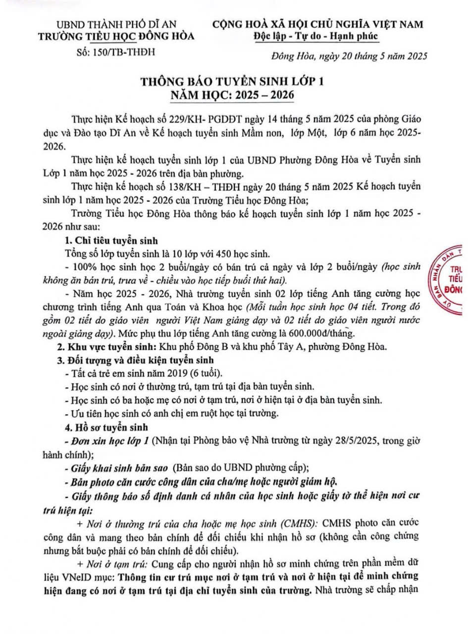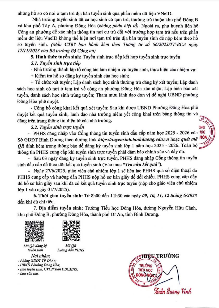 Trường Tiểu học Đông Hòa thông báo tuyển sinh, năm học 2025-2026.